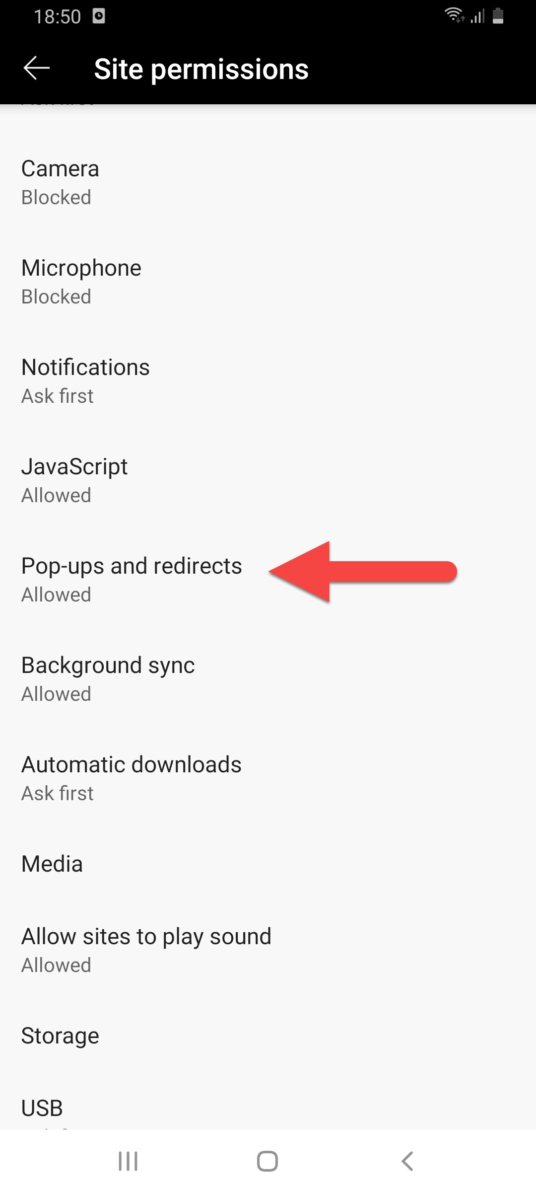 Click on the Site Permissions Step 4. Here click on the Pop-ups and Redirects.