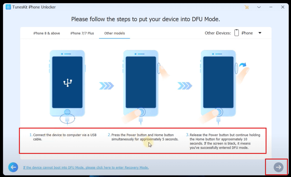 Start Step 3. Put your iPhone into DFU or recovery mode. For that, you can read the instruction in the TunesKit interface. When it is done click Next to continue.