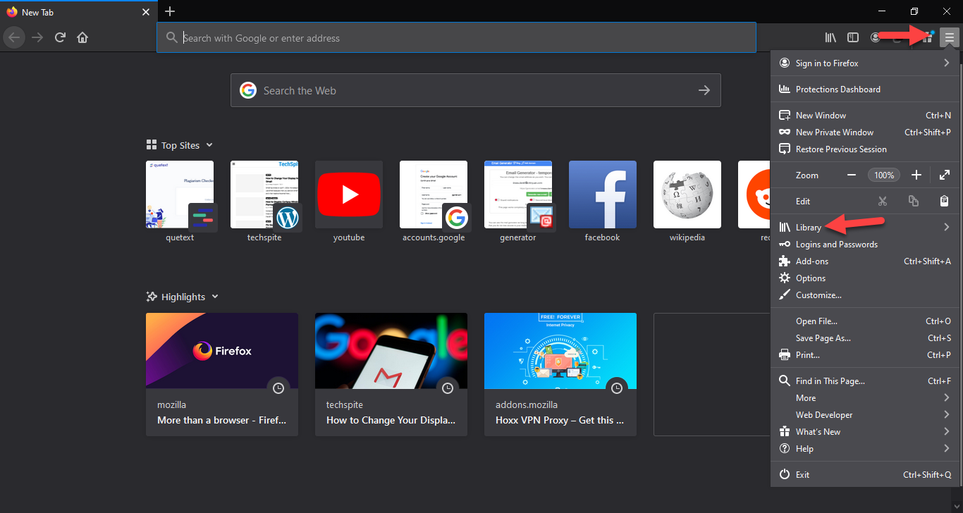 Step 1. Open the Firefox then click on the Three Line at the top right corner after that click on the Library.
