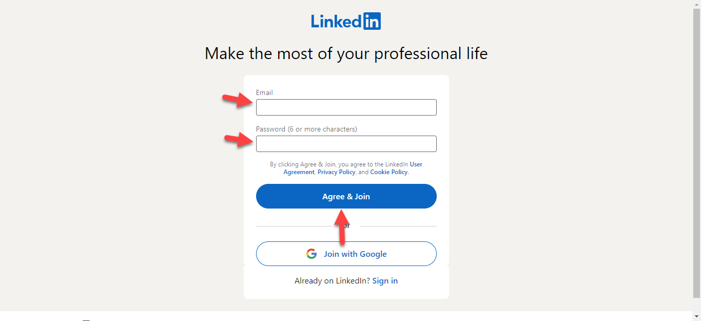 Step 3. Here simply type yo email address or password that you want to create a LinkedIn account after that click on the Agree & Join.