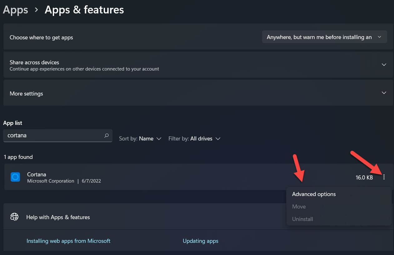 Step 3. Once you get Cortana then click on the Three Dots next to it and select Advanced Options.
