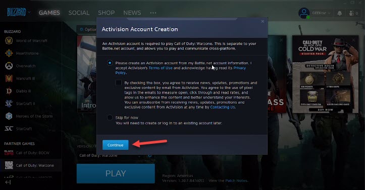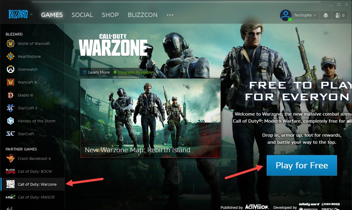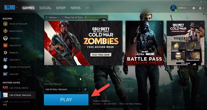 Click on the Login Step 12. When the blizzard is open then go to the Call of Duty: Warzone at the left side of the blizzard screen. Then click on the Play For Free.