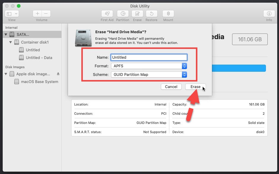 After that, you need to go to Disk Utilities, make sure to select disc drive. In macOS Catalina which is the new operating system of Ma company, there are two parts at a time, Mackintosh and Mackintosh – Data. Therefore, you have to delete these two disc drives. Select the drive, enter any name for the drive, select the disc drive format APFS, and click on the Erase button in order to delete it.