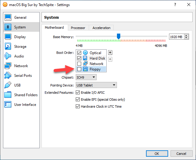 1. Select the Virtual machine and click on the Settings. When the Setting opened, from the right pane make sure to select System. There you have to uncheck the Floppy and move to the Processor tab, increase the number of Processor up to 2GB or more than that for better performance.