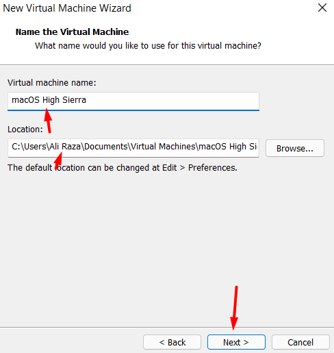 Step 5. Name the virtual machine macOS High Sierra and select where you save the file and click on the Next.