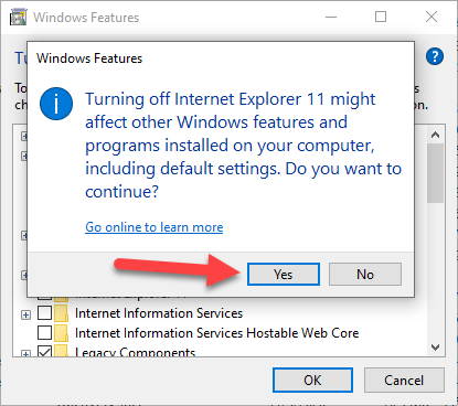 Step 4. Next, From the list you need to find Internet Explorer 11 then uncheck the box after that click on the OK.