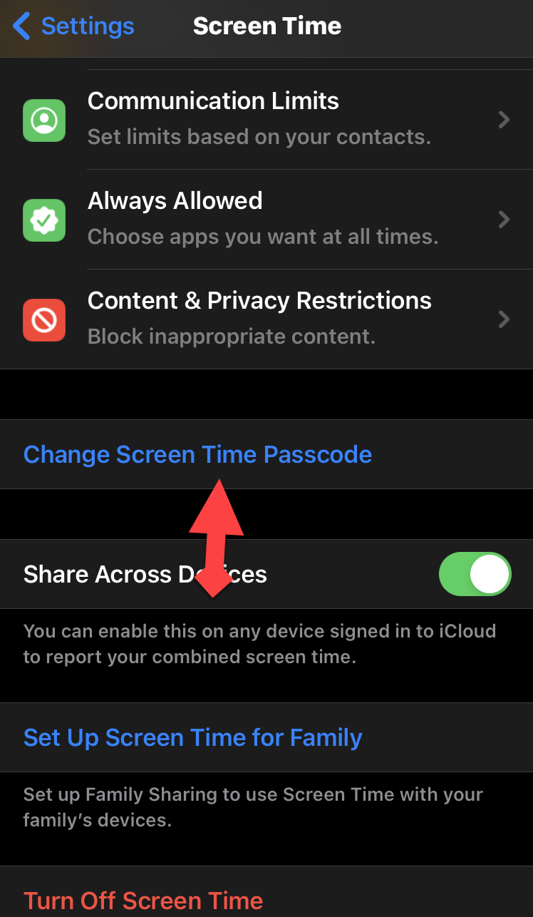 Screen Time 3. On-Screen Time screen, scroll down and tap on the Change Screen Time Passcode.