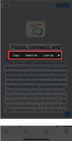 Step 4. Once, you select the text by moving your fingers then you will able to copy it, lookup, translate, and share the text.