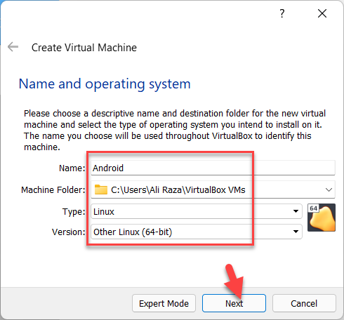 Click On The New Step 2. In the name section type Andriod and in type select the Linux and in Version select the Other Linux and then click on the Next.