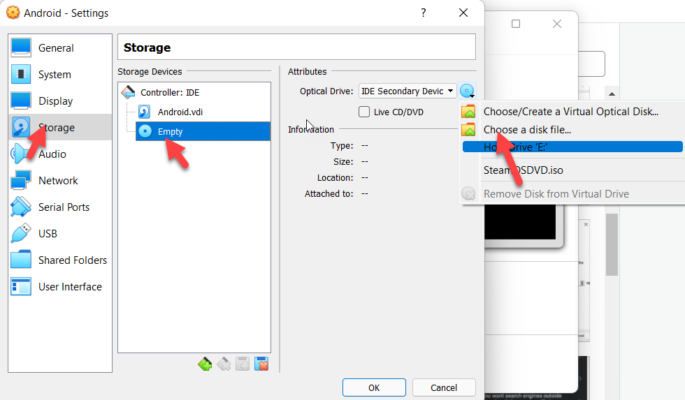 Click On The Setting Step 9. Now, go to the Storage tab and click on the Empty and click on the blue disk icon on the top right corner and then click on the Choose a disk file.