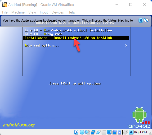 Click on the start Step 2. Select the Installation – Installing Android-x86 to hard disk and press enter.