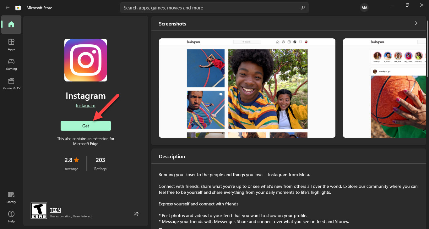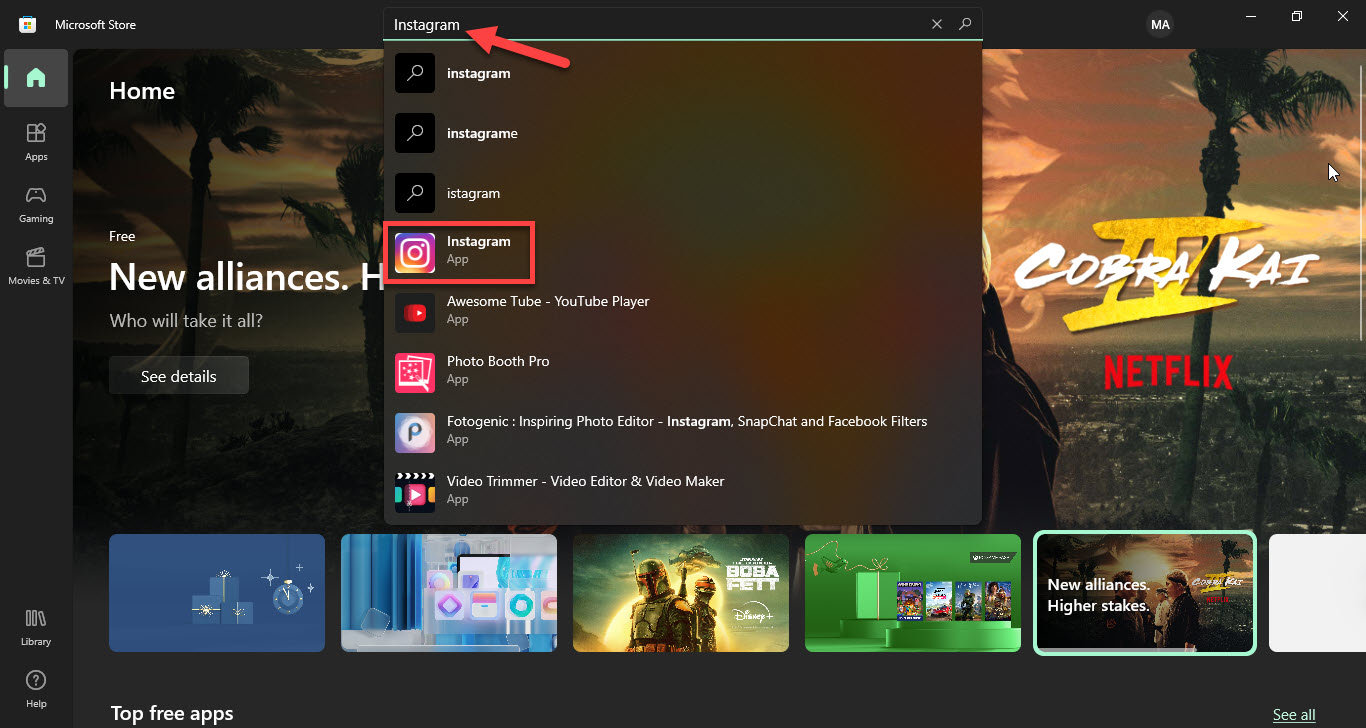 Step 1. First of all, open the Microsoft Store then go to the search bar after that search for Instagram the Instagram will pop up click on it.