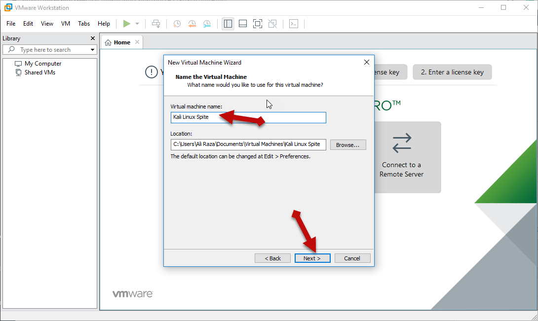 Linux Step 6: Name the virtual machine as you want. I will simply name as Kali Linux spite.