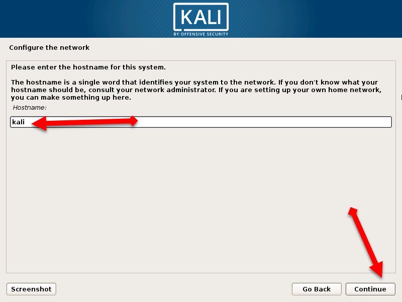 Step 6: type a Hostname you can type which you want but I will go as a default name Kali.