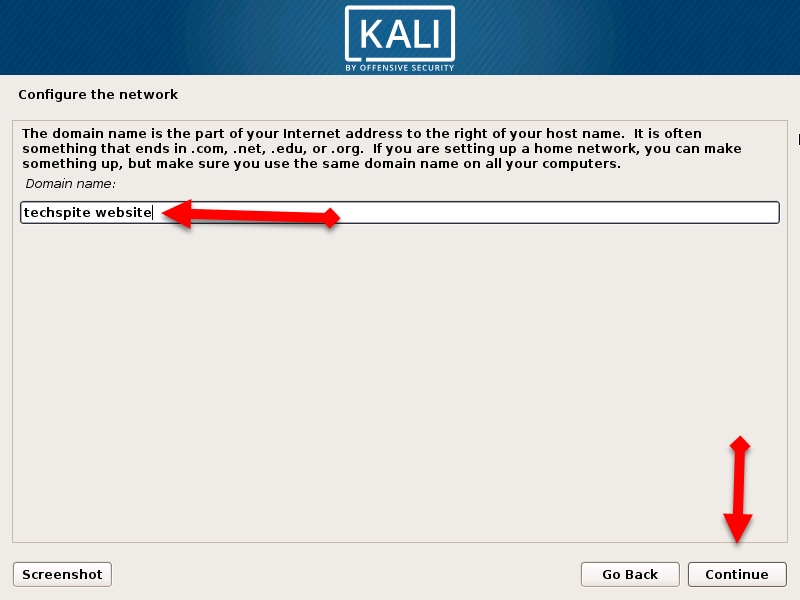 Hostname Step 7: After that, give a domain name to your Kali Linux simply I will give techspite website.