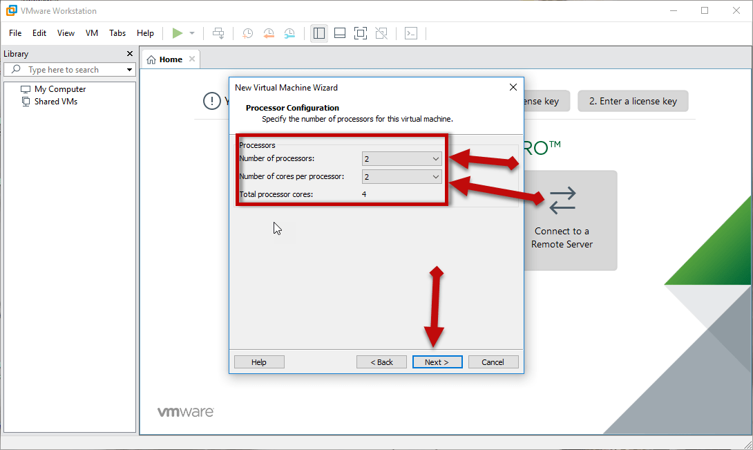 name your virtual machine Step 7: In this step, you have to configure the processor then both processor should 2 and total processor core should 4.