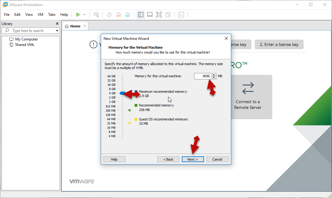 Step 8: Select the amount of memory for the virtual machine then the memory should be at least 4GB.