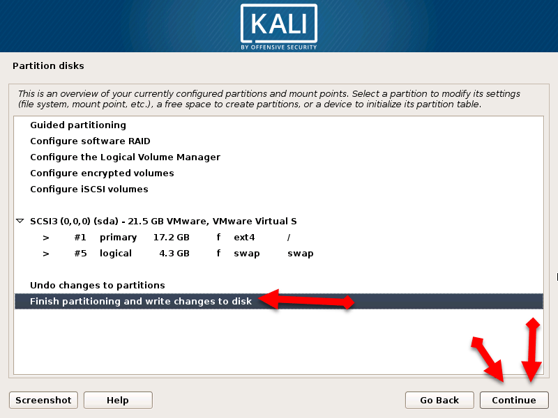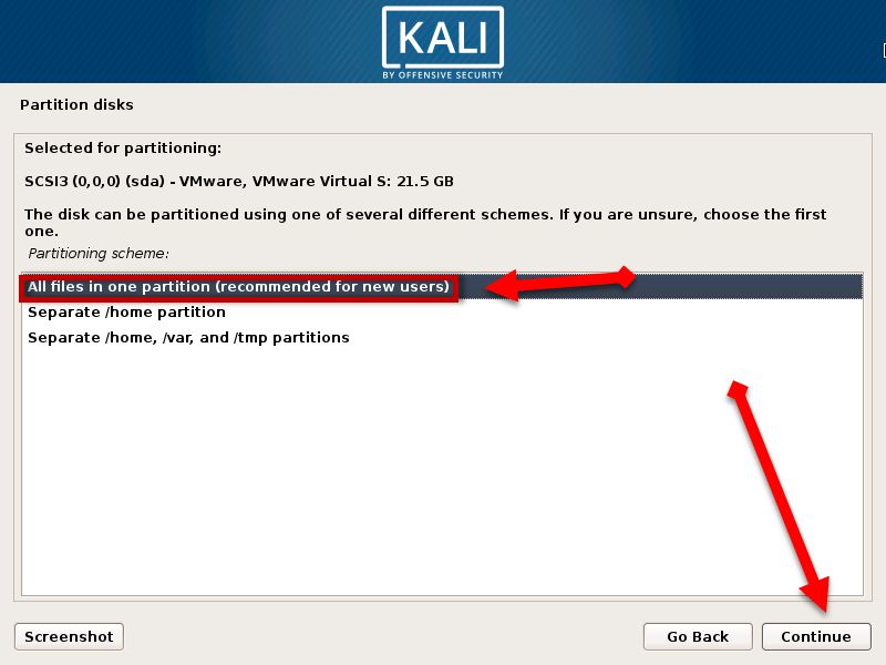 Select the All files in one partition (recommended for new user) Step 13: After that, you will see lots of option then you need to click on the Finish partitioning and write changes to disk. And click on the continue button.