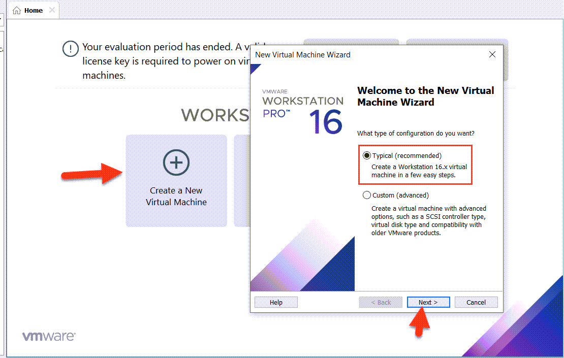 1. Open up the VMware and select ‘create a new virtual machine’. A new window will pop up, you have to select ‘Typical’ and click next.