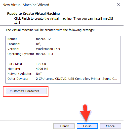 Specify disk size 6. On ready to create virtual machine window, click customize hardware.