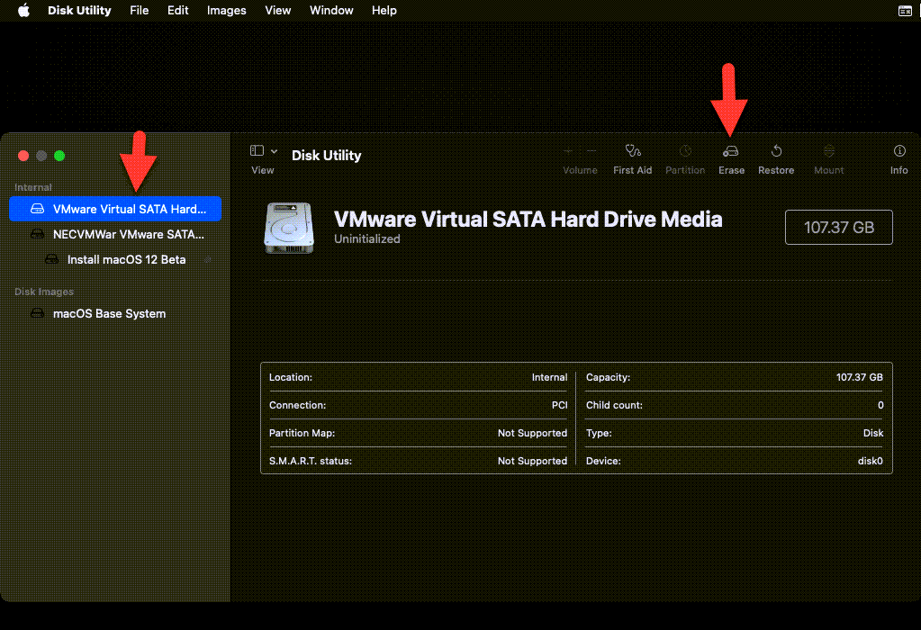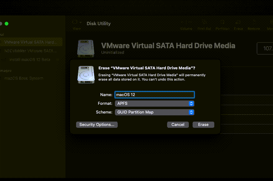 Disk Utility 5. On the disk utility window, select VMware Virtual SATA Hard Drive Media and click Erase button.