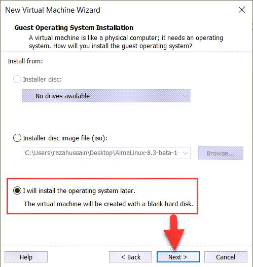 Create a new virtual machine 2. Then, select the last option that is ‘I will install the operating system later’, and click next.