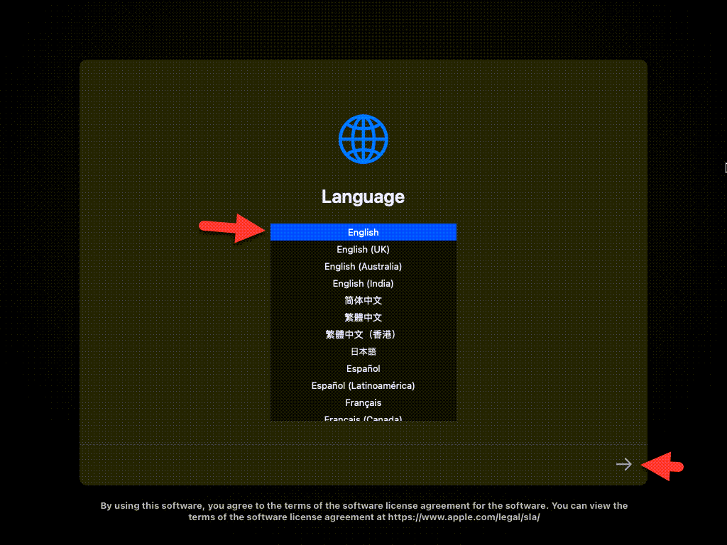 Booting 3. Langauge window will be opened, select English and click on the Next arrow.