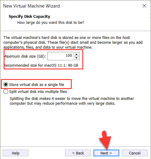 5. Specify the disk size for macOS Monterey. It would be better if you increase the size up to 50GB. And select Store virtual disk as a single file the click next.