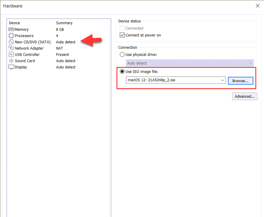 9. Go to the CD/DVD (SATA), then select Use ISO Image File: and click browse. Select the macOS Monterey ISO File which you have downloaded.