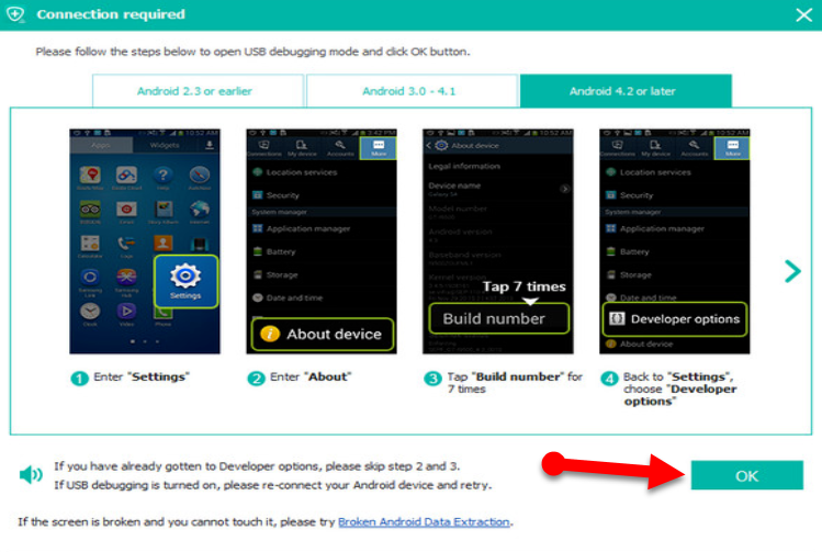 Connect your Device Step 2. In this step, you have to enable the debugging mode in order to allow the Fonelab software to scan your device. If you don’t know and don’t have an idea about enabling the debugging mode. Then you have to just follow the simple and clear guide on your screen in Fonelab. After enabling the debugging mode make sure to click on the Ok in order to go ahead.