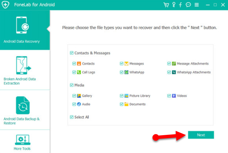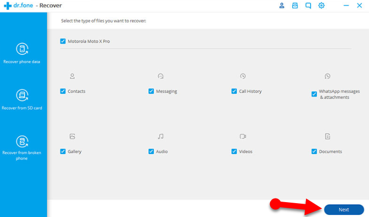 USB Debugging Step 3. When your devices have connected to your Pc, Dr.Fone data recovery will display for you the files type which it supports and able to recover. So, by default, the data recovery has marked all file types. After that, you will need to select the file types that you want to recover and then click on Next in order to proceed further with the recovery process.