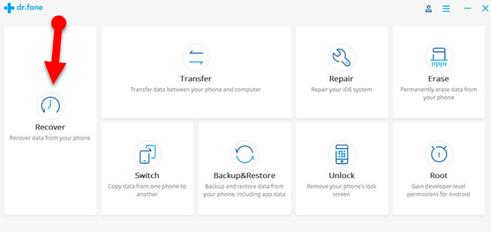 Step 1. First of all, you have to download the Dr.fone from the above link and install it on your PC. Launch the Dr.Fone software by double-clicking on that. When the screen of Dr.Fone appears you have to click on the Recover option.