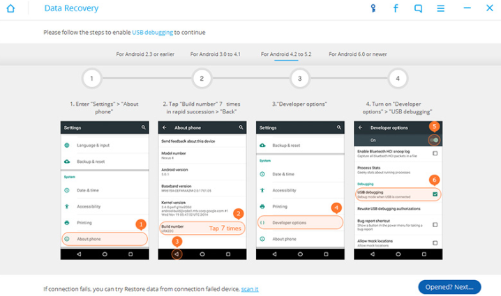 Recover Data from your phone Step 2. Now, connect your device to your Pc with the USB cable to make sure to enable the debugging mode. If you don’t have idea about debugging mode then follow the easy and simple steps on the screen of Dr.Fone.