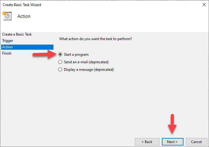 Click on the Next Step 5. Check the Start a Program then you need to click on the Next.