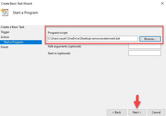Click on the Next Step 6. Tap on the Browser to select the batch file after that click on the Next.