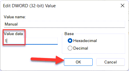 Step 3. Next, double-click on the Manual then changes the value data from 0 to 1 after that click on the Ok.