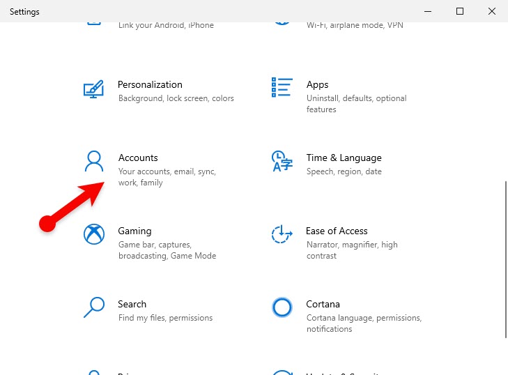 2. On the Settings window, you will see many options and click on the Accounts (Your account, email, sync, work, family).