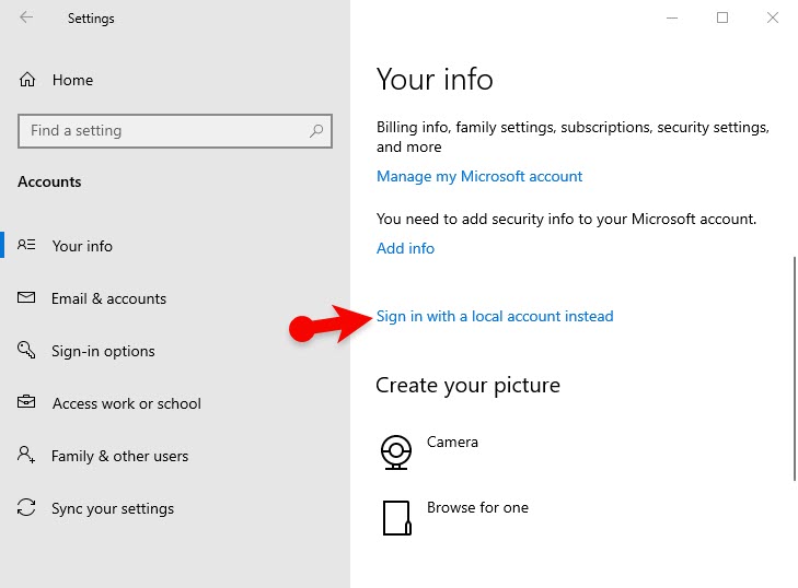 Accounts 3. On Your Info window, click on the Sign in with a local account instead.