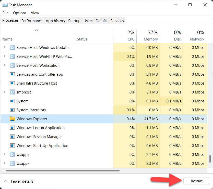 Step 2. Now, scroll down until you can not find the Windows Explorer once you find that click on the Restart at the bottom left corner.