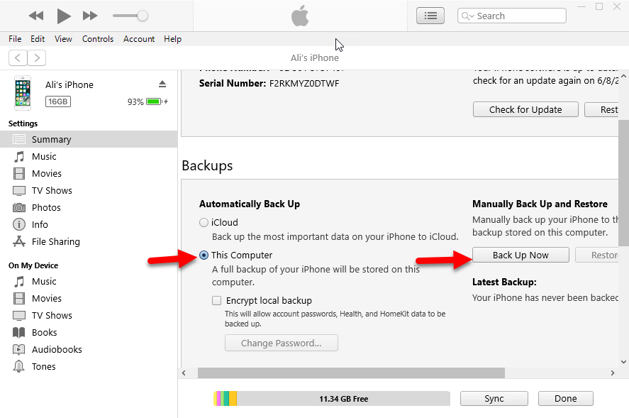 Step 4. In order to backup your iPhone from iTunes, scroll down and find the Backup section. There you need to select the This Computer option and then click on the Backup Now.