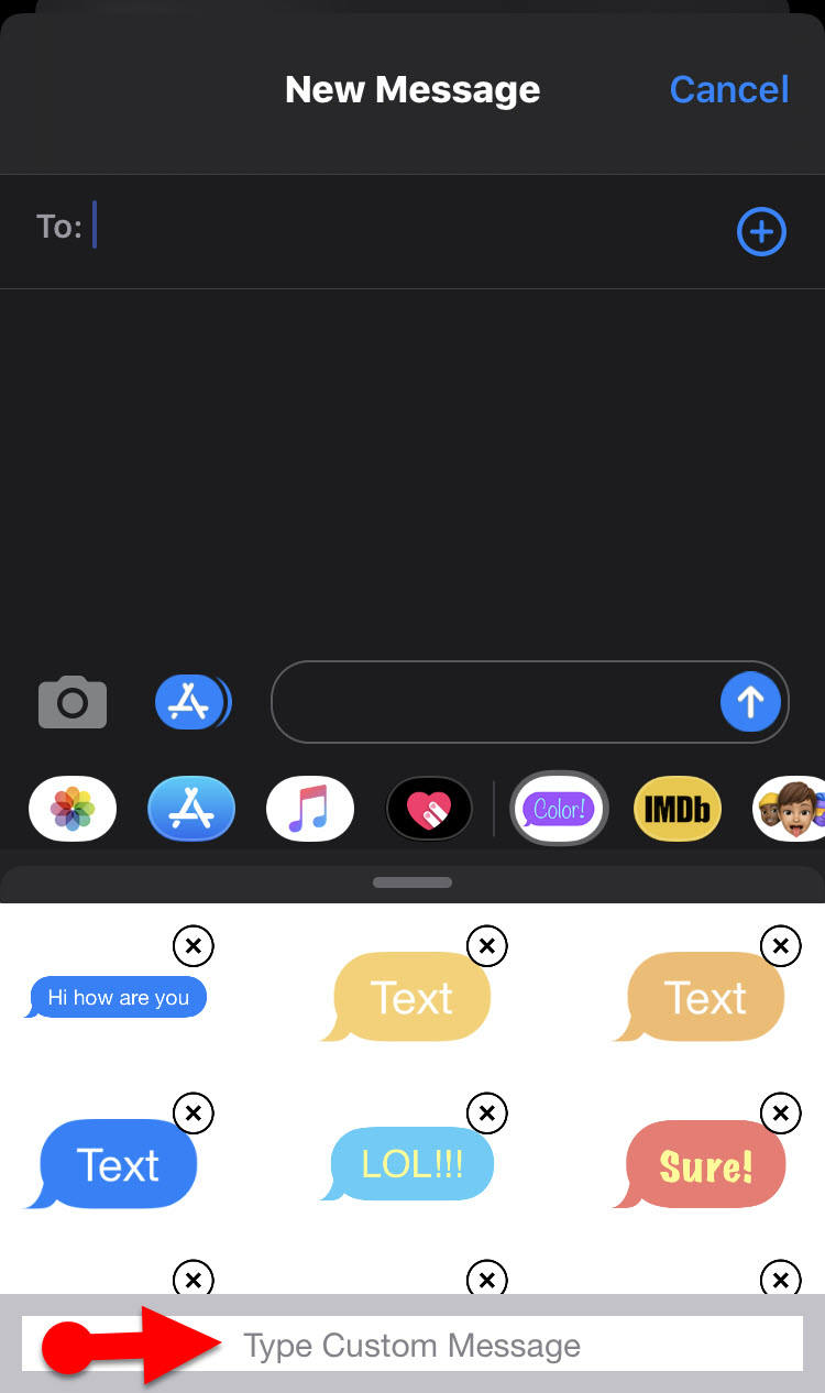 Color Text Bubble on iMessage Step 2. After downloading Color Text Bubble on the iMessage app on your iPhone. Now, you need to launch the iMessage app and create a new message. Then, scroll from right to left from the messaging option below the message box and tap on the Color!.