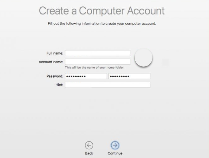 Terms and Condition Step 6. After that, fill out the following information to create your computer account. You have to provide your Full name, Account Name, Password, and Hint. Then, click on Continue for creating a computer account.