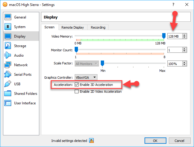 Processor Step 4. In this step, go to the Display tab, and select Video Memory and increase the size up to 128 MB, then select and enable Enable 3D Acceleration.