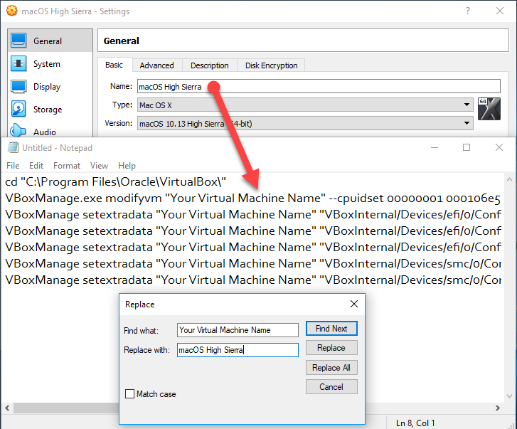 Command Prompt Step 2. After that, once the CMD launched, you need to change the name of the operating system on Code, open the setting of macOS High Sierra and Copy that and go to Edit on Notepad, select Replace and edit that there. And you need to change Your Virtual Machine Name with your virtual machine.