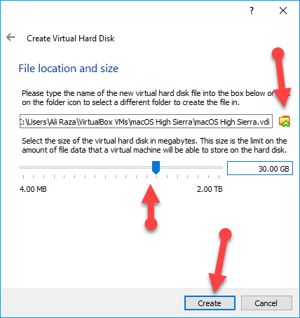 File location and size The setting of Virtual Machine for macOS High Sierra