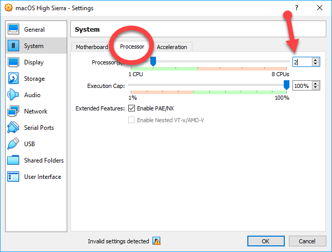 System Step 3. Then, go to the Processor from the system tab, increase the number of processors up to 2, the Execution cap should be 100% and also enable the extended feature.