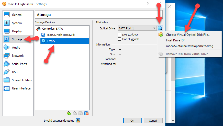 Display Step 5. Once the above steps are all done, go to the Storage tab, you have to select Empty and press on the CD icon on the right hand. Then choose a Virtual optical Disk file. And select the macOS High Sierra DMG file which you have downloaded from the above link, after that click on the Open.