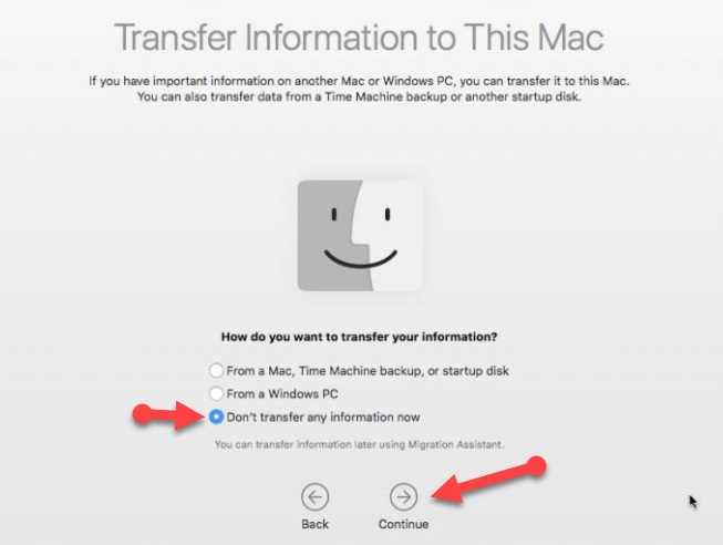 Select Your Keyboard Step 3. In the window of Transfer Information to This Mac, If you have important information on another Mac or Windows PC, you can transfer it to this Mac. Therefore, I suggest you select Don’t transfer any Information Now, and click Continue.