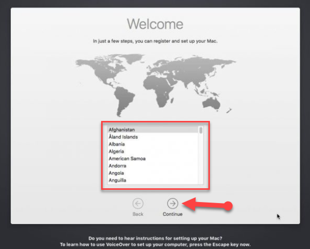 Step 1. Start your Virtual Machine. And after that you will see a welcome screen of macOS High Sierra, you will be asked to choose your country,